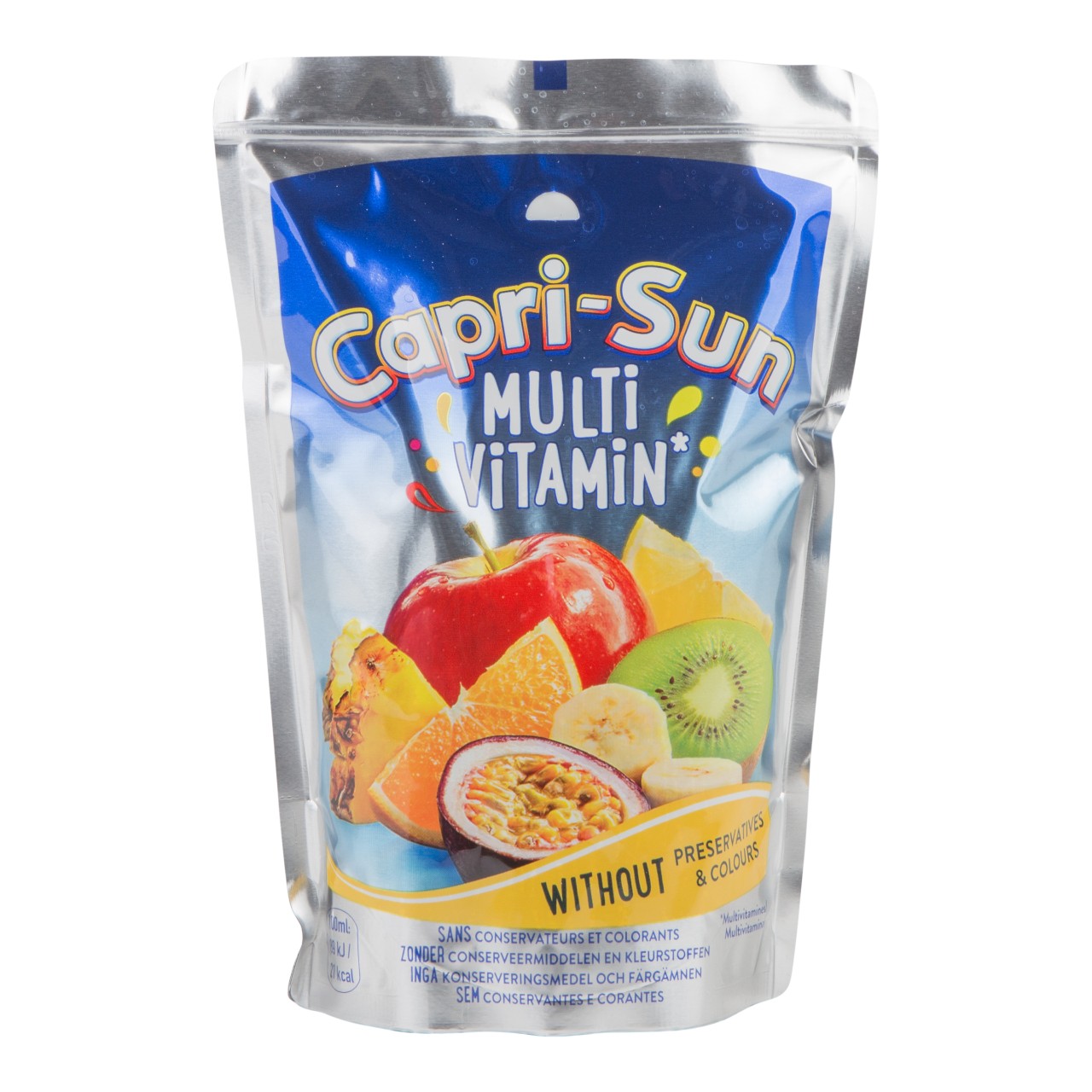 Capri-Sun Multi Vitamin is een verfrissend drankje op basis van bronwater en verschillende sapconcentraten. In deze sappenverzamelingen vinden we onder meer citroen, appel, kiwi, ananas, pompelmoes, sinaasappel, banaan en passievrucht terug.